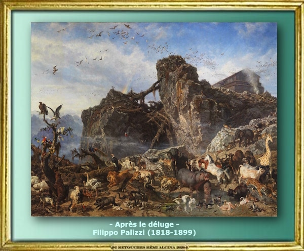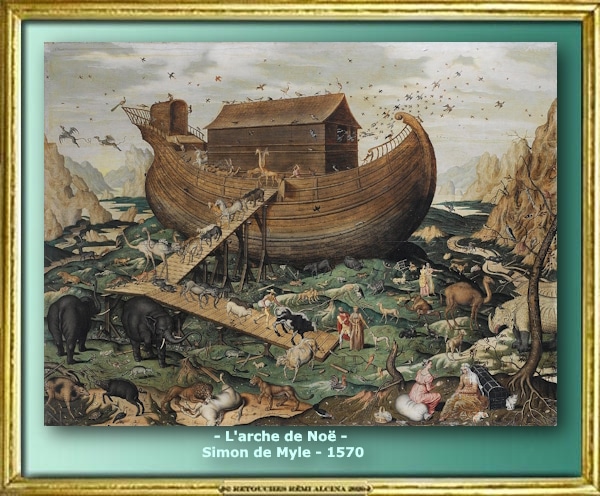 « Nous entrons dans l’arche (en nous) pour échapper à nos représentations égotique (déluge) jusqu’à la maîtrise l’apaisement de notre mental (moi, ego…) nous sommes consolé (avec le soleil) apaisé (avec la paix)… analogie avec Jonas et la baleine ? – Note Rémi ALCINA –