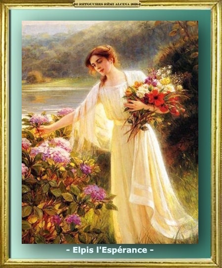 « Dans la mythologie grecque, Elpis (en grec ancien ἐλπίς / elpís) est la personnification de l’espoir. Elle est dépeinte comme une jeune femme portant généralement des fleurs ou une corne d’abondance dans ses mains. Elle serait la fille de Nyx, déesse de la nuit et la mère de Phème, déesse de la réputation, de la renommée et de la rumeur. » – https://franco.wiki/fr/Elpis_(mythologie).html –