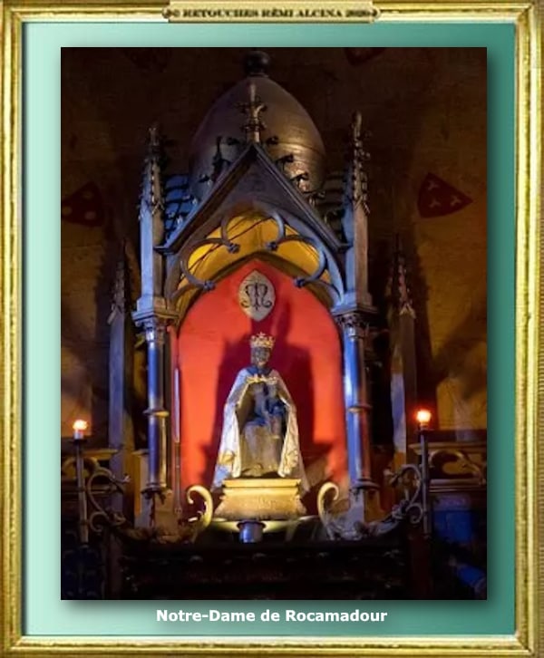 «Notre-Dame de Rocamadour, but d’un pèlerinage fameux, déjà fréquenté l’an 1166, est une madone miraculeuse dont la tradition fait remonter l’origine au juif Zachée, chef des publicains de Jéricho, et qui domine l’autel de la chapelle de la Vierge construite en 1479. C’est une statuette de bois, noircie par le temps, enveloppée dans une robe de lamelles d’argent qui en consolide les débris vermoulus. « La célébrité de Rocamadour remonte au légendaire ermite, saint Amateur ou Amadour, lequel sculpta en bois une statuette de la Vierge à laquelle de nombreux miracles furent attribués. On raconte qu’Amateur était le pseudonyme du publicain Zachée, converti par Jésus-Christ ; venu en Gaule, il aurait propagé le culte de la Vierge. Celui-ci est fort (78) ancien à Rocamadour ; cependant, la grande vogue du pèlerinage ne date que du XIIe siècle. » – FULCANELLI – Julien CHAMPAGNE – LE MYSTÈRE DES CATHÉDRALES en PDF – Page 23 – Télécharger : Fulcanelli – Le Mystère des Cathédrales