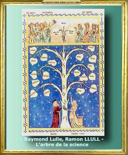 « Raymond Lulle, 1235-1315 : Pour l’Inquisition, Raymond Lulle fut un hérétique, pour l’école franciscaine, il fut un saint, de son propre aveu il fut un « procureur des infidèles ». Aujourd’hui, il apparaît comme un philosophe et un penseur mystique à l’intersection de trois cultures : arabe, juive, chrétienne. Né à Majorque d’une famille noble, Raymond Lulle vit à la Cour dès l’âge de douze ans. Ardent et plein d’imagination, il se livre jusqu’à trente ans aux plus vives passions amoureuses et littéraires. Œuvre principale : – Arbor scientiae. » – https://classes.bnf.fr/dossitsm/b-lulle.htm –