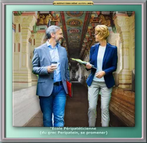 « École Péripatéticienne (du grec Peripatein, se promener), Aristotélisme. – Le Péripatétisme est le nom donné à la doctrine d’Aristote, parce que ce philosophe avait l’habitude d’enseigner en se promenant dans les galeries du Lycée. » – http://www.cosmovisions.com/Peripatetisme.htm –