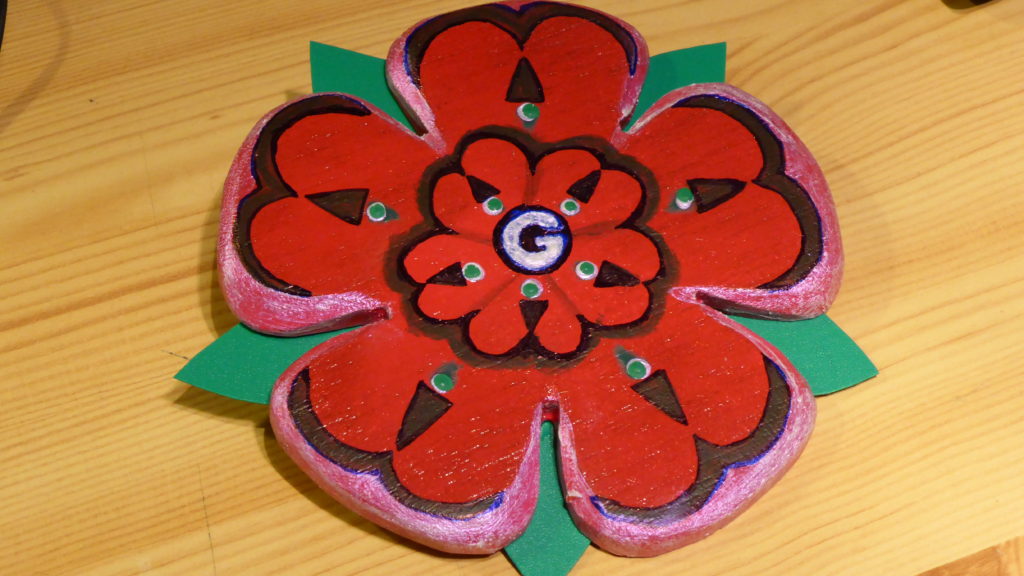 « La Rose Rouge qui se situe à l’intersection de la Verticale qui est la recherche de la Vie Spirituelle ,et de l’Horizontale qui Symbolise la Vie Terrestre. Dans le Langage des fleurs la rose rouge Rose Rouge Symbolise l’Amour, qui est le message du Christ : Aime ton Prochain comme toi-même. » – Jea∴ DEL∴ -« Symbolisme du 2° Tem∴ – SC702 – Ami∴ Uni∴- Val∴Mon∴ – 6013 –