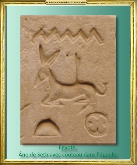 « L’âne dans l’Égypte ancienne, il était le plus souvent associé au meurtrier d’Osiris, Seth et on dessinait dans le hiéroglyphe de l’âne un couteau planté dans son épaule afin de lui ôter ce pouvoir mortel. Ceci n’est pas sans rappeler l’épée à double tranchant de la tradition hébraïque. En grec le dieu Dionysos est représenté chevauchant un âne. Midas le roi de Phrygie ne sut pas reconnaître la supériorité des sons que le divin apollon tira de sa cithare, sur ceux de son rival, il reçut les oreilles d’âne, de qui, qui sait, lui, discerner les sons divins. – le bonnet d’âne était primitivement donné à l’écolier, non pas pour lui faire honte, mais pour qu’il apprenne à entendre. – la tradition chrétienne gardait vivant il n’y a pas si longtemps, le symbolisme du lièvre et du lapin. Animaux aux longues oreilles. Oreilles et œufs de pâques se rejoignent dans le symbolisme de la résurrection. » – http://aleph.beyt.chez-alice.fr/ane.html –